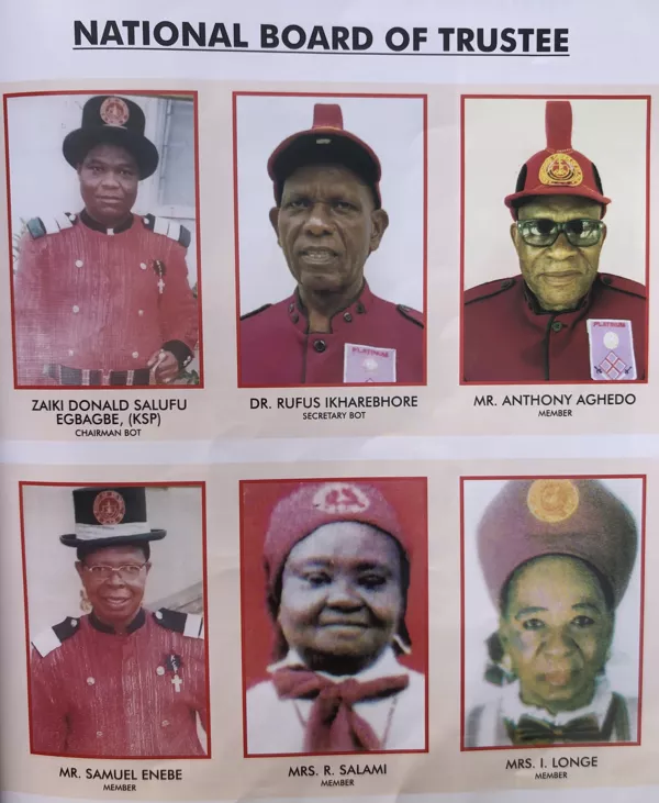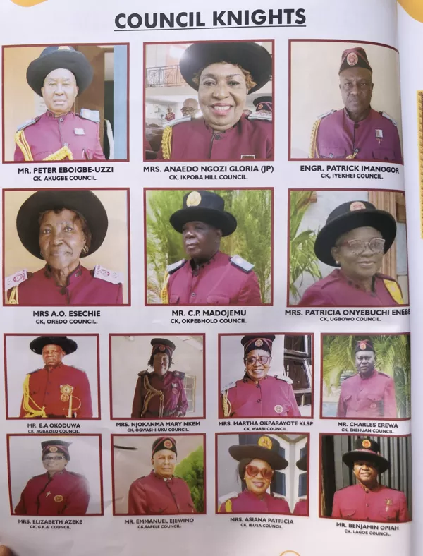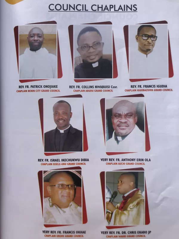 The Order also had Rev. Fr. Victor Darlington, Rev. Fr. James Chima and Rev. Fr. Patrick Osagie, lev. Fr. Christopher Okechukwu as Grand Council Chaplains and Rev. Fr. Kingsley Aniakor. Very Rev. Fr. Cletus Omojie Is the incumbent National Council Chaplain.