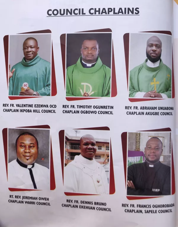 The three councils in the Metropolitan See of Benin City Archdiocese namely Akugbe, Oredo and Uselu Councils have Rev. Fr. Raphael Ifejioku, Rev. Fr. John E. Ograh and Rev. Fr. Charles Obiora as Chaplains, respectively.