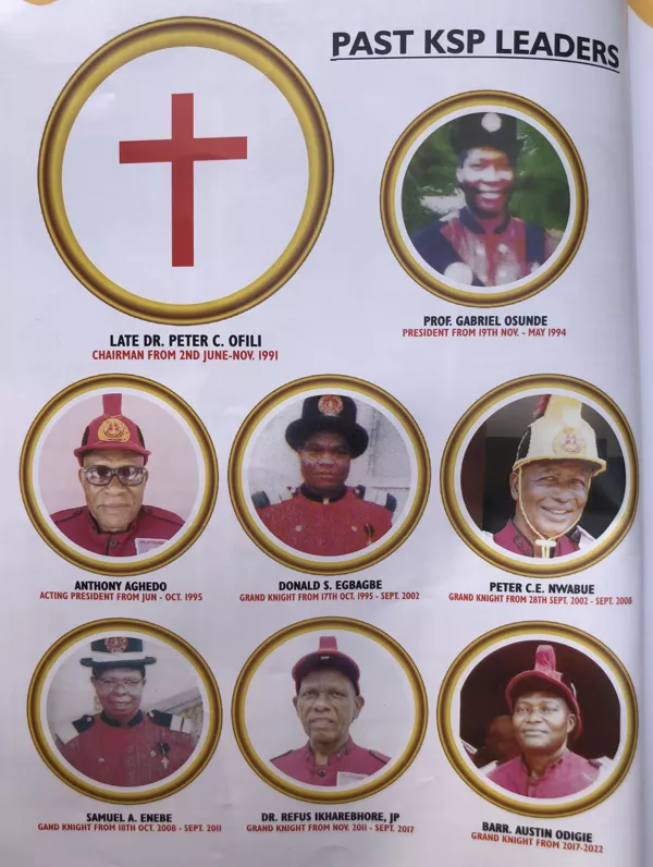 The Knighthood Order has the benefit of the invaluable services of committed members as leaders – Late Dr. Peter C. Of iii was appointed Chairman by our Founder at the inauguration of the Order in June 1991 and served till November of the same year. Prof. Gabriel Osuide was elected president on 19th November, 1991 and served till May, 1994. Mr. Anthony Aghedo was elected Acting President in June 1994 and served till October 1995. Mr. Donald S. Egbagbe served as Grand Knight for two tenures from 17th October 1995 to September 2002. Mr. Peter Nwabuo led the Order as Grand Knight for two tenures from 28th September, 2002 to September,2008, while Mr. Samuel Enebe piloted the affairs of the Order as Grand Knight from 18th October, 2008 to 17th September, 2011.